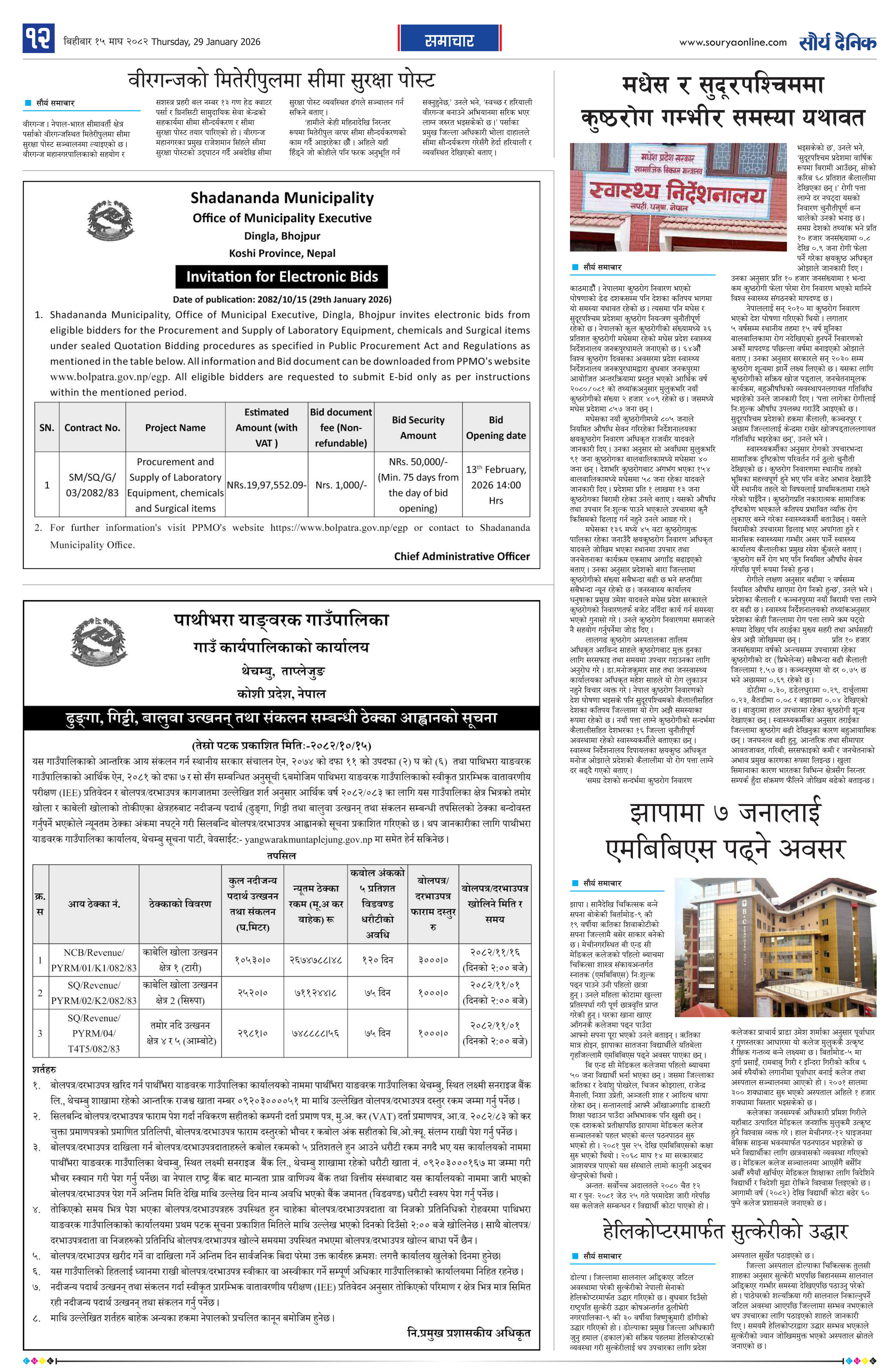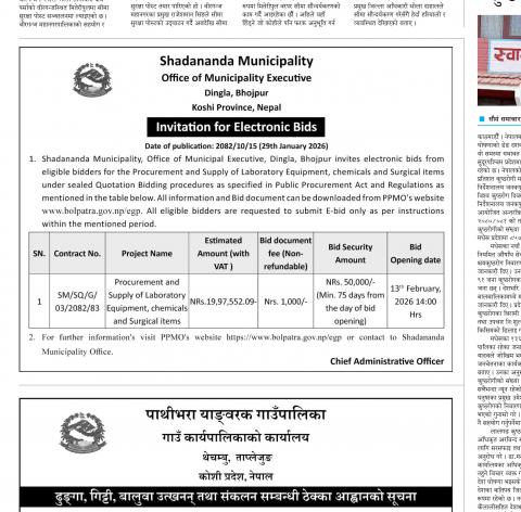 प्रयोगशाला उपकरण, केमिकल तथा सर्जिकल सामाग्रीहरु खरिदका लागि अनलाइन बोलपत्र आह्वानको सूचना !!!