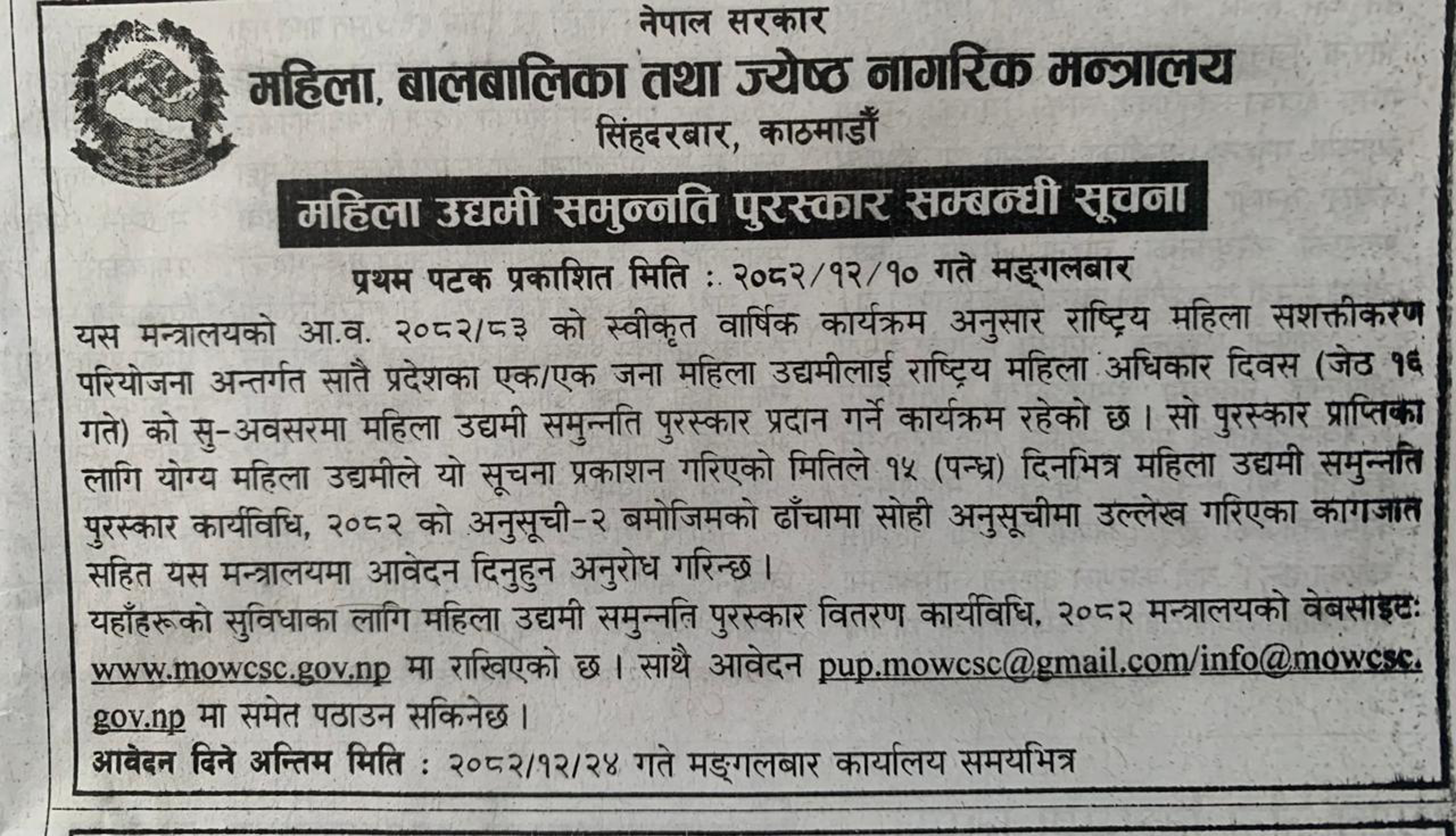 महिला, बालबालिका तथा जेष्ठ नागरिक मन्त्रालय सिंहदरबार, काठमाडौंको महिला उद्यमी समुन्नति पुरस्कार सम्बन्धी सूचना !
