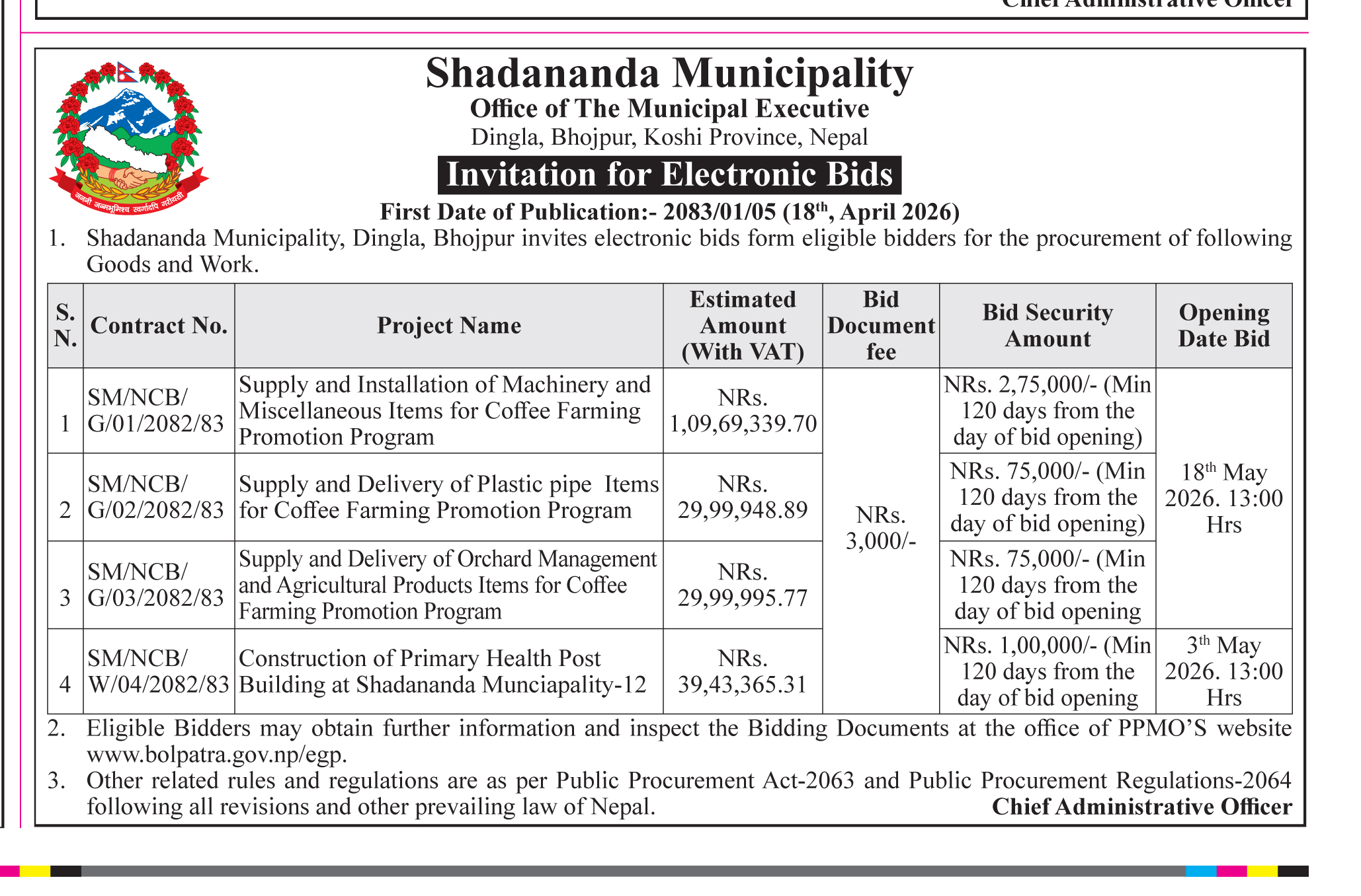 षडानन्द १२ स्वास्थ्य चौकी भवन देउराली निर्माण र कृषि सम्बन्धी मेशिनरी औजारहरु, पाइप लगायत कृषि सामाग्रीहरु खरिद कार्यका लागि अनलाईन बोलपत्र आह्वानको सूचना !!!