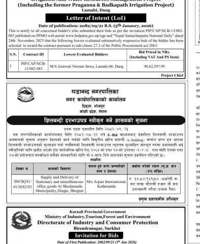 स्टेशनरी लगायत आवश्यक कार्यालय सामान तथा मसलन्द सामाग्रीहरु खरिद सम्बन्धी बोलपत्र आह्वानको दोश्रो पटकको सूचना !!!