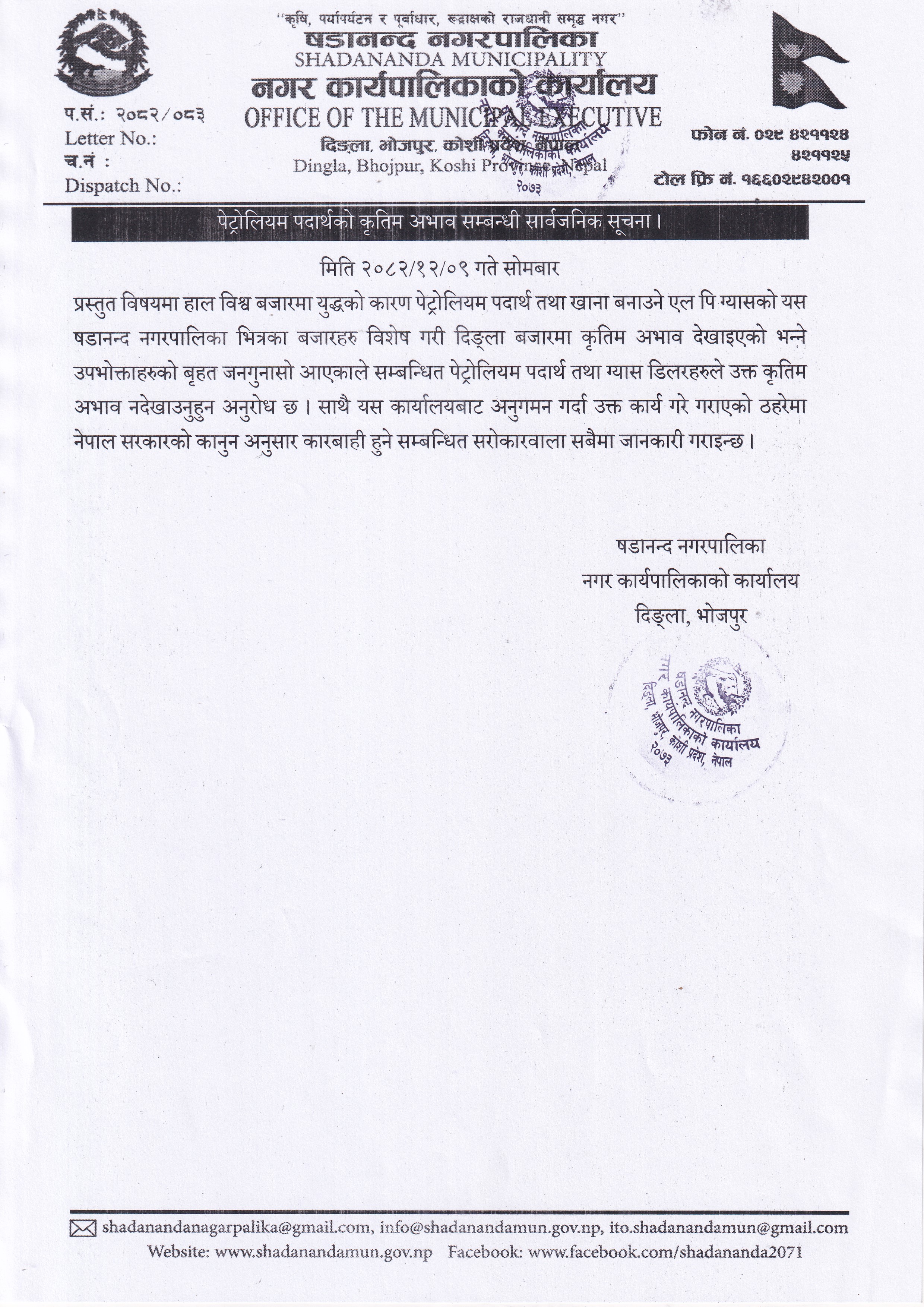 » पेट्रोलियम पदार्थको कृतिम अभाव सम्बन्धी सार्वजनिक सूचना !
