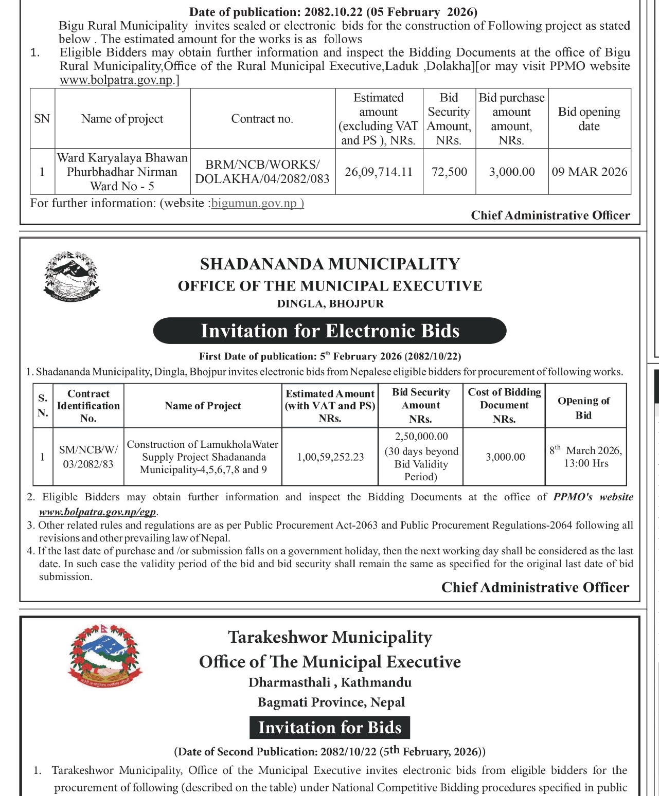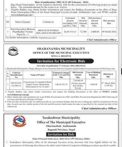 » लमुखोला खानेपानी आयोजना षनपा ४, ५, ६, ७, ८ र ९ निर्माण गर्न बोलपत्र आह्वान सम्बन्धी सूचना !!!