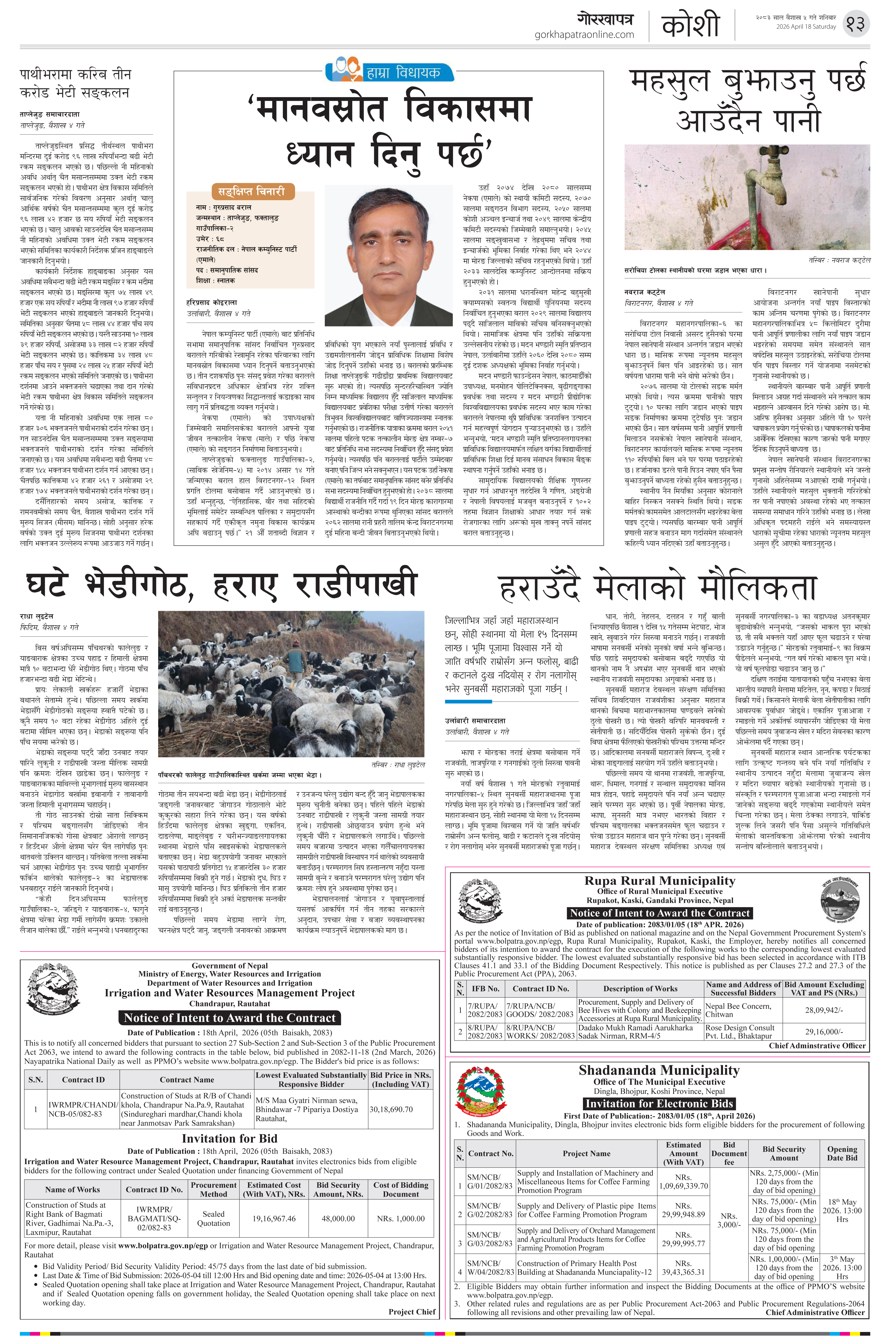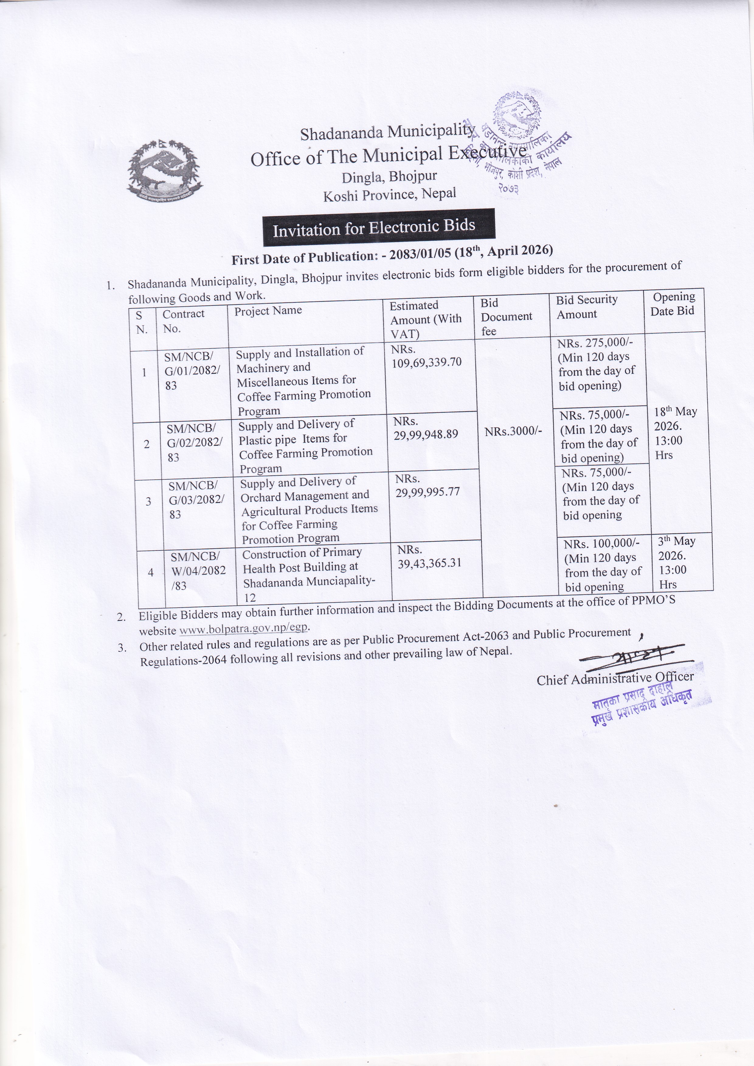 षडानन्द १२ स्वास्थ्य चौकी भवन देउराली निर्माण र कृषि सम्बन्धी मेशिनरी औजारहरु, पाइप लगायत कृषि सामाग्रीहरु खरिद कार्यका लागि अनलाईन बोलपत्र आह्वानको सूचना !!!