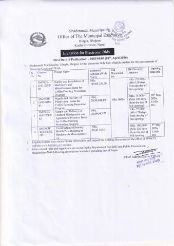Home » षडानन्द १२ स्वास्थ्य चौकी भवन देउराली निर्माण र कृषि सम्बन्धी मेशिनरी औजारहरु, पाइप लगायत कृषि सामाग्रीहरु खरिद कार्यका लागि अनलाईन बोलपत्र आह्वानको सूचना !!!